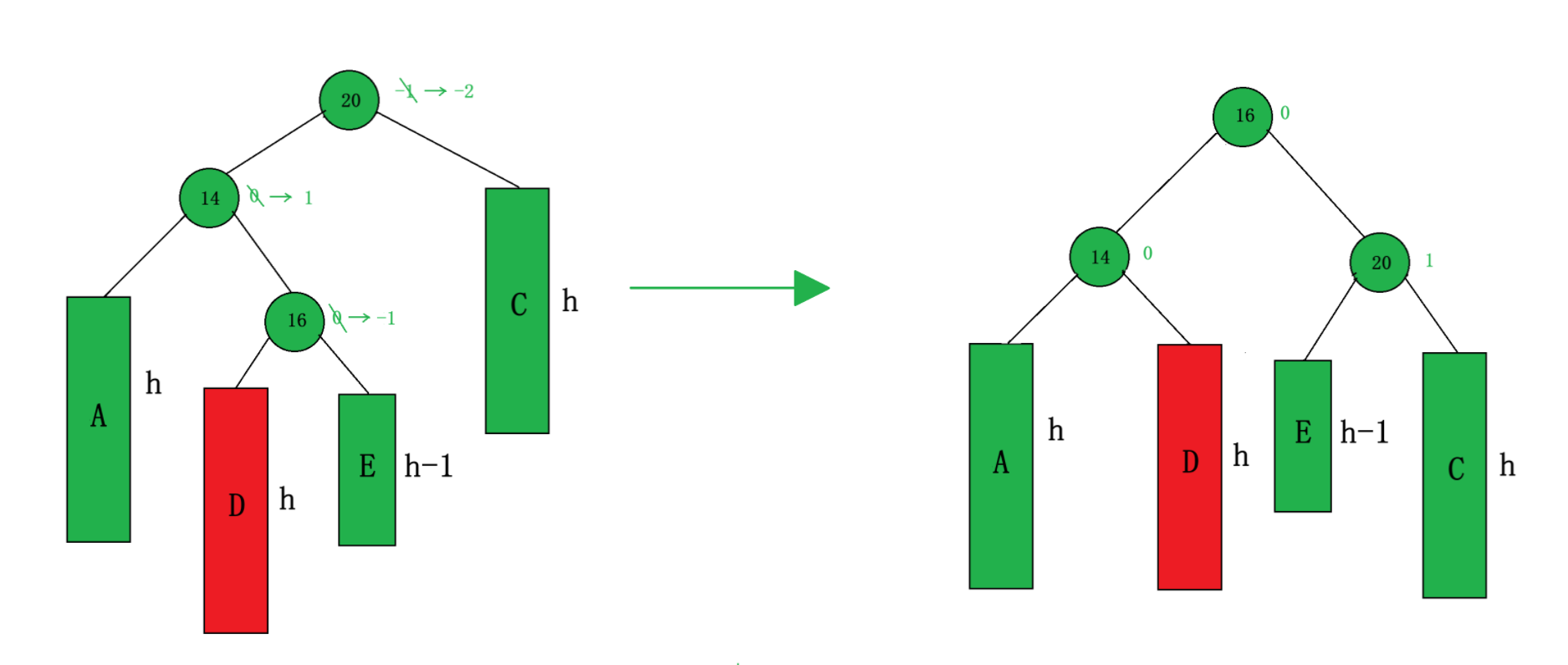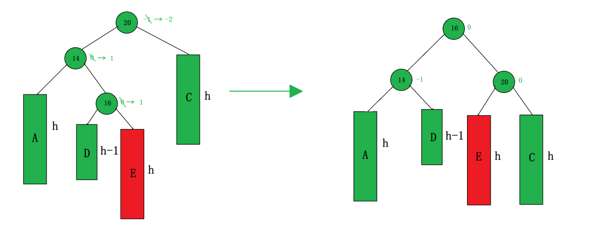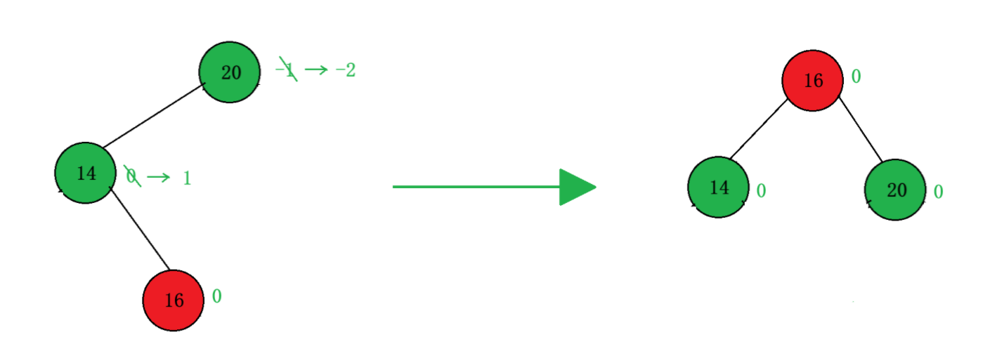 更新平衡因子时出现了 -2,此时需要进行旋转处理,旋转之后的树会变为:
