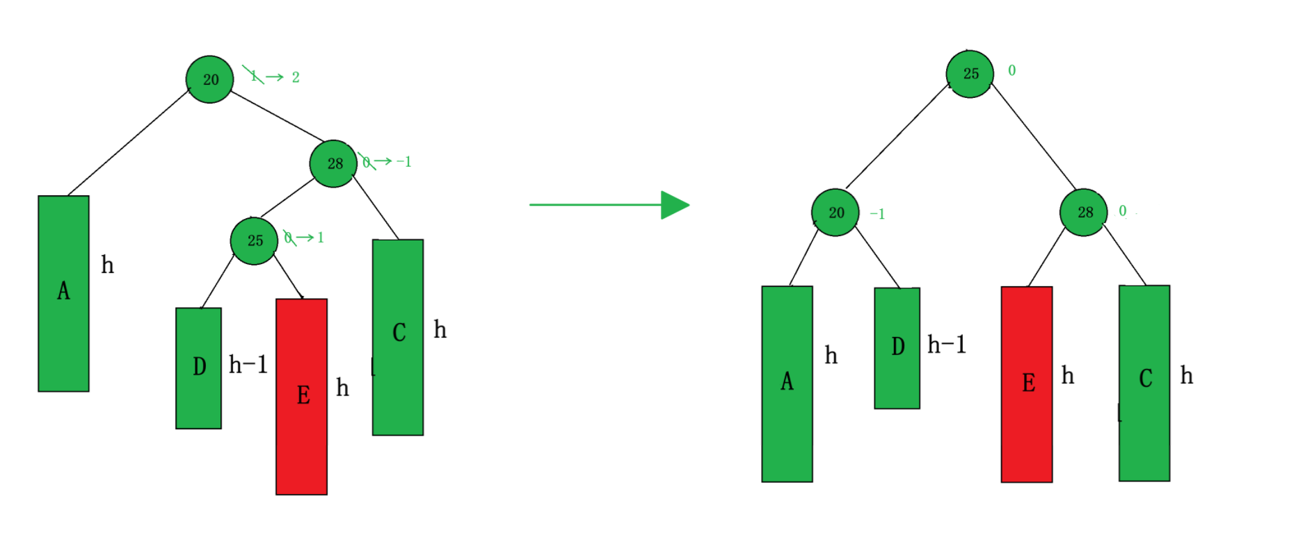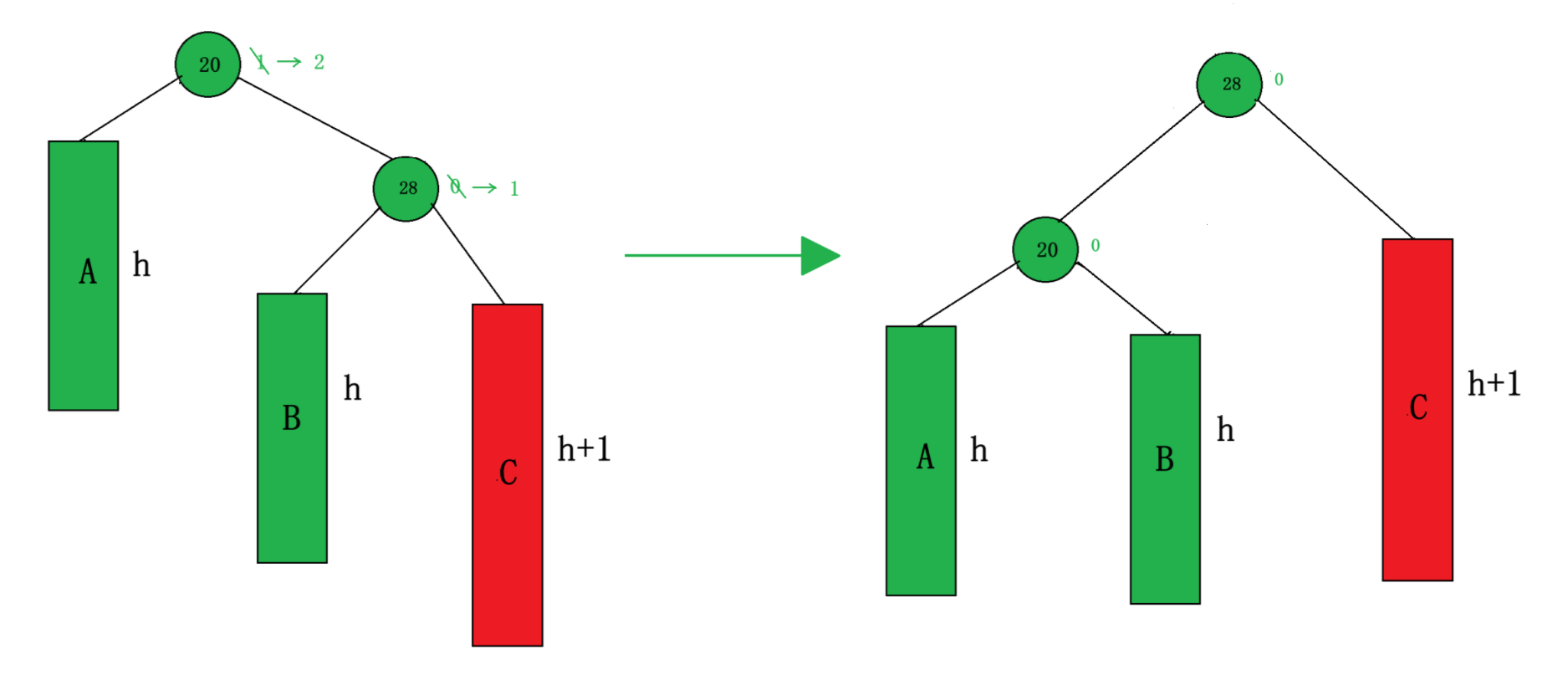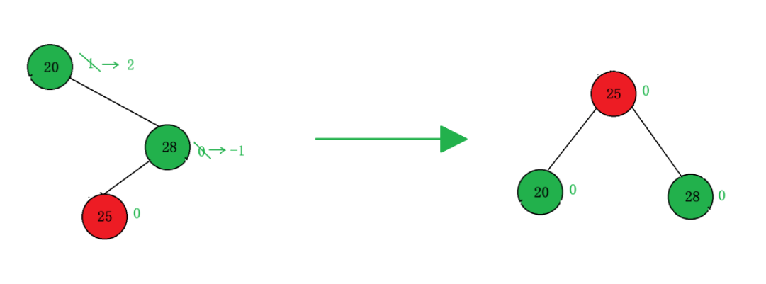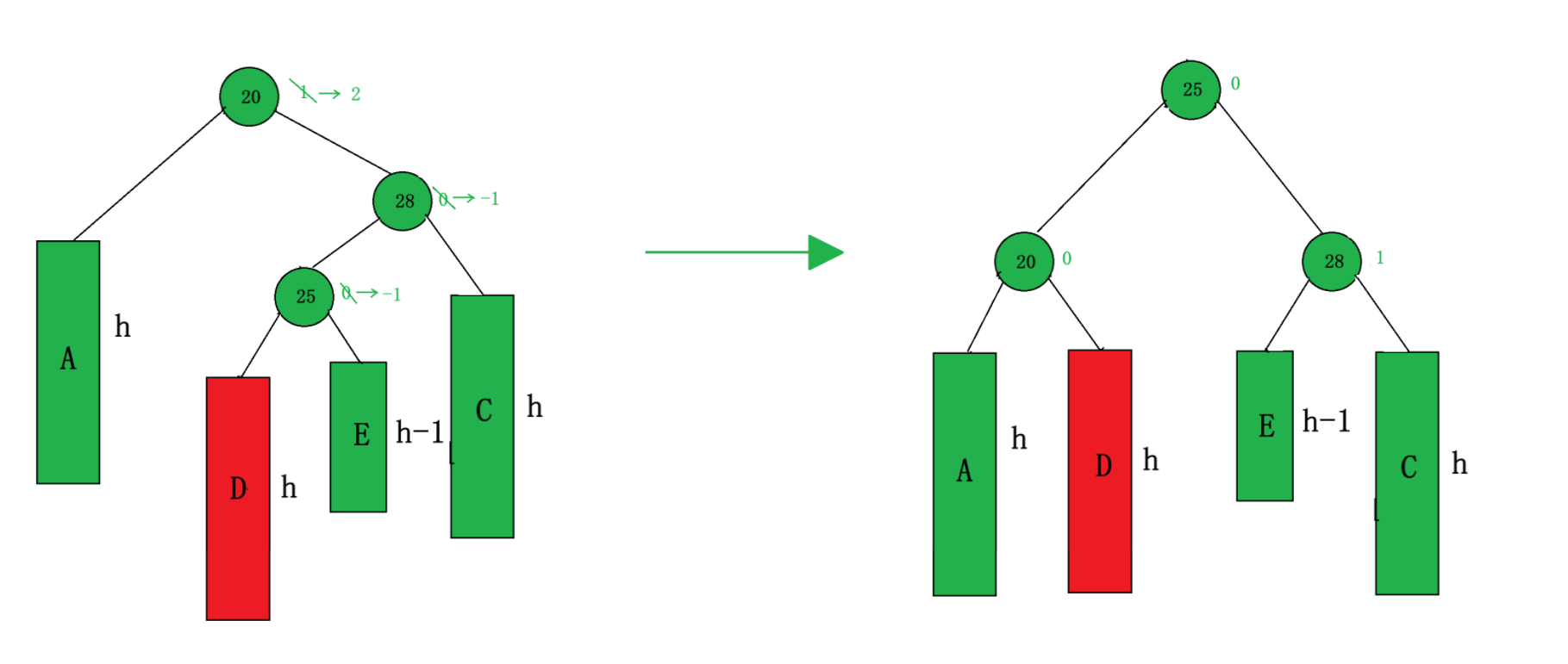 更新平衡因子时出现了 -2,此时需要进行旋转处理,旋转之后的树会变为: