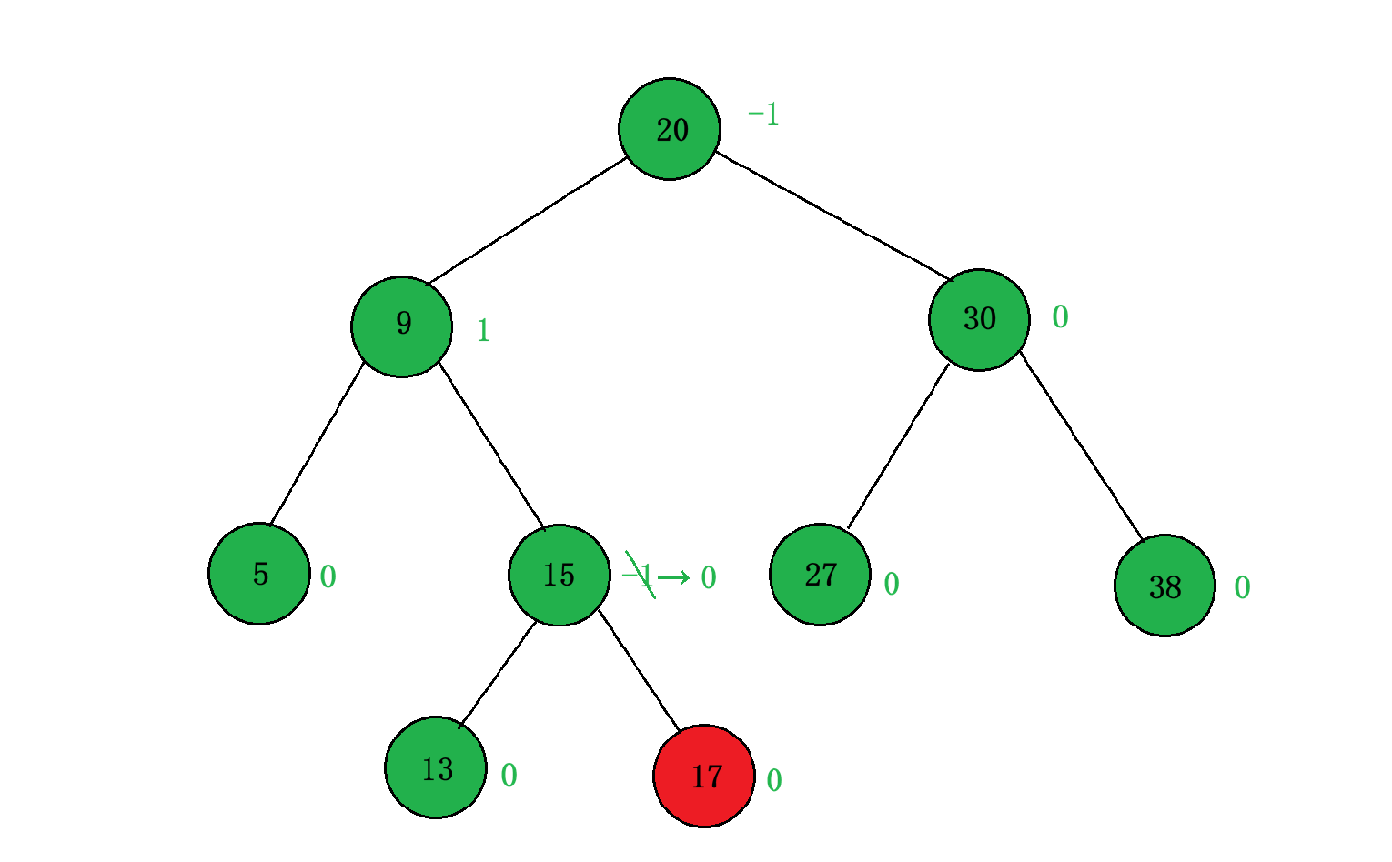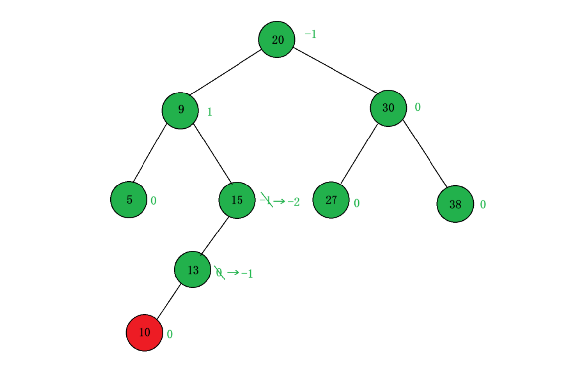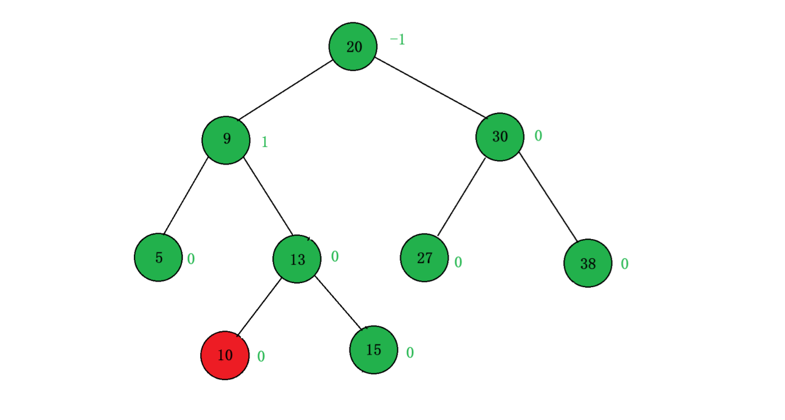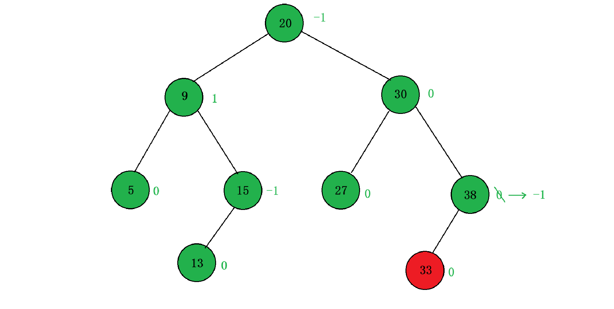 红色节点为新插入的节点,将 parent 节点的平衡因子更新为了 -1,但是看 38 的 parent 节点 30,其右子树的高度变为了 2,所以应该也将其更新为 1,对于根节点也是一样的,由于其右子树节点高度变为了 3,所以其平衡因子应该更新为 0。所以插入一个节点之后,不仅要更新当前节点父亲节点的平衡因子,其所有祖先的平衡因子都要更新。究其原因就是因为如果插入节点的 parent 子树高度变化了,其所有祖先的高度也必然会发生变化,所以所有祖先的平衡因子都要更新。