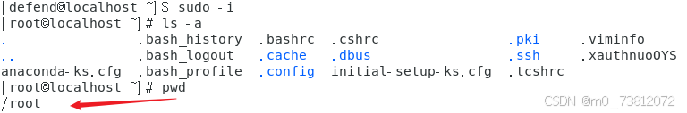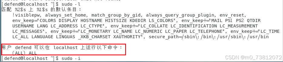 含义:defend 用户可以以任何用户(包括 root)身份 ,执行任何命令,而且不限制命令、不限制路径、不限制参数。