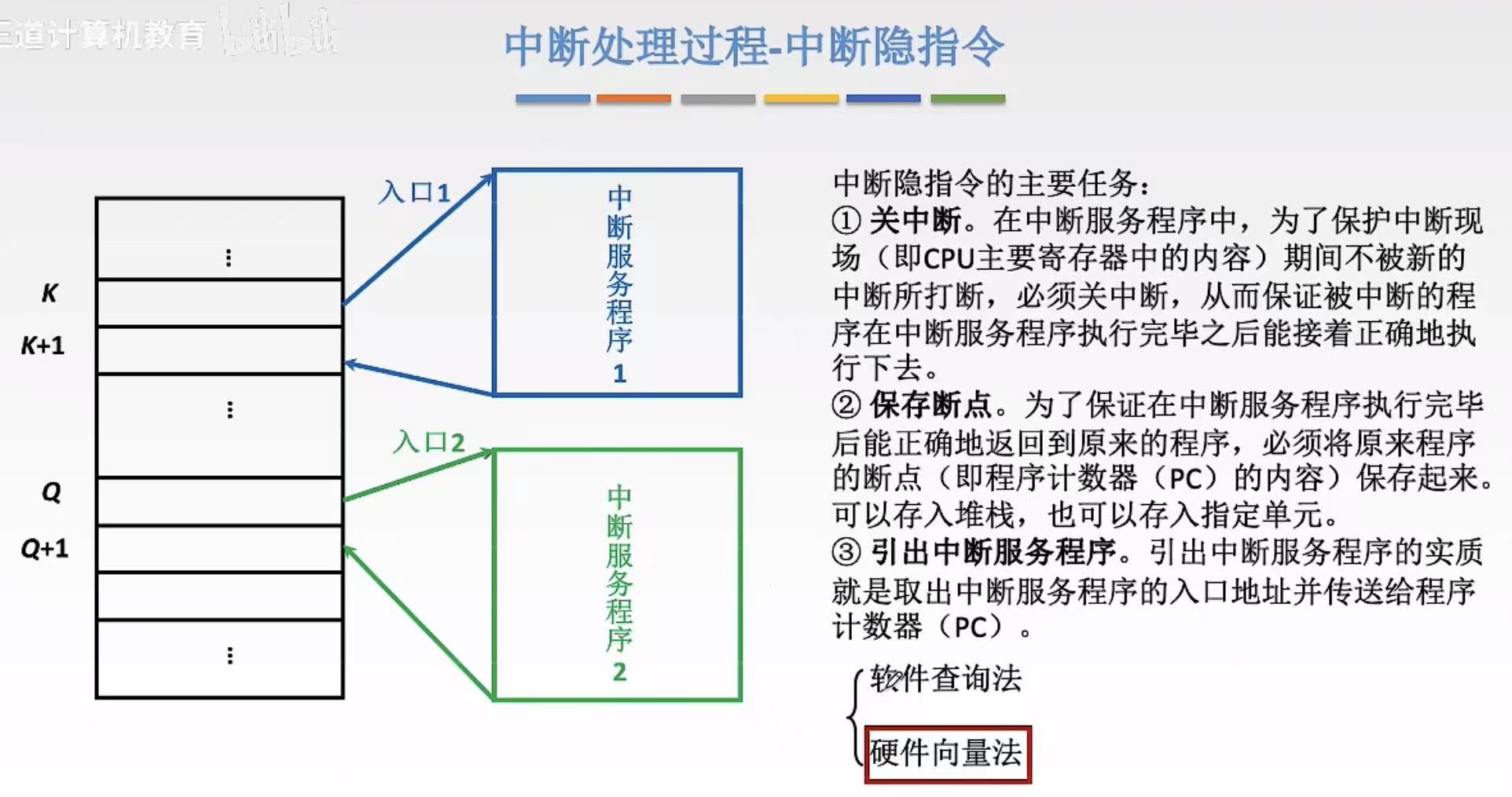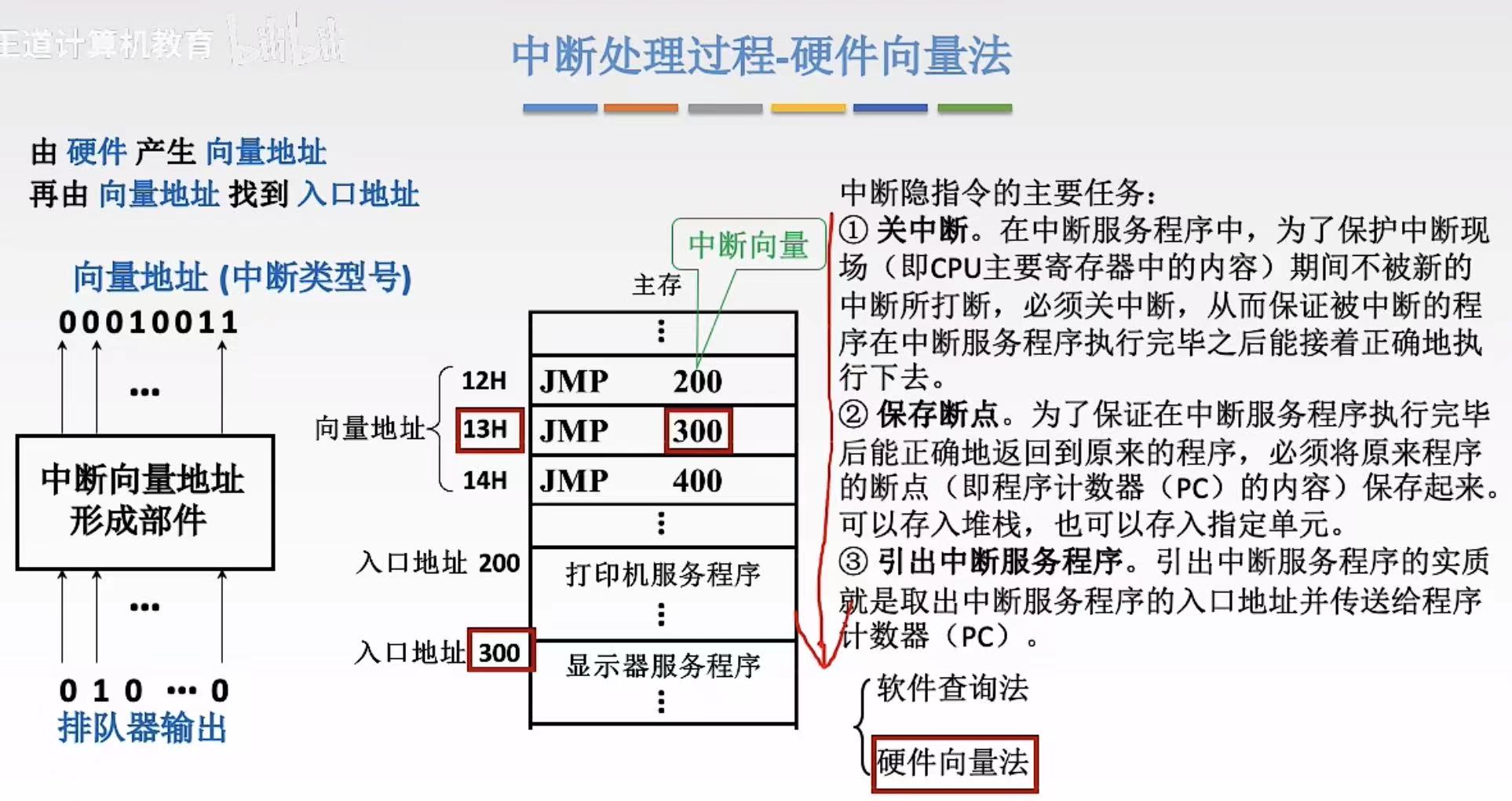 当外设发生中断时,由硬件自动产生一个中断类型号(中断向量),CPU 根据这个编号查表,快速找到对应中断服务程序的入口地址,并跳转执行。