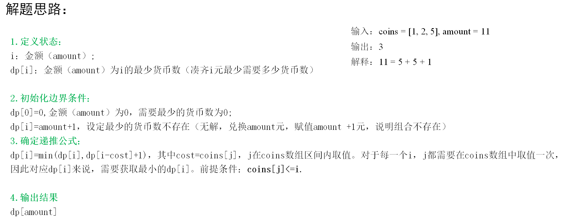 给定数组 coins ,coins中所有的值都为正整数且不重复。每个值代表一种面值的货币,每种面值的货币可以使用任意张,再给定一个amount,代表要找的钱数,求组成amount的最少货币数。