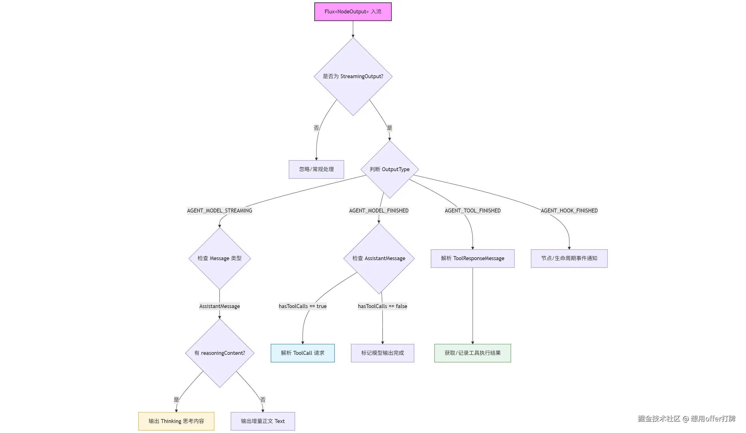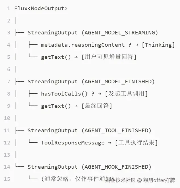 Flux<NodeOutput>) - 支持混合流(模型输出 + 工具调用 + Hook 事件交错出现)