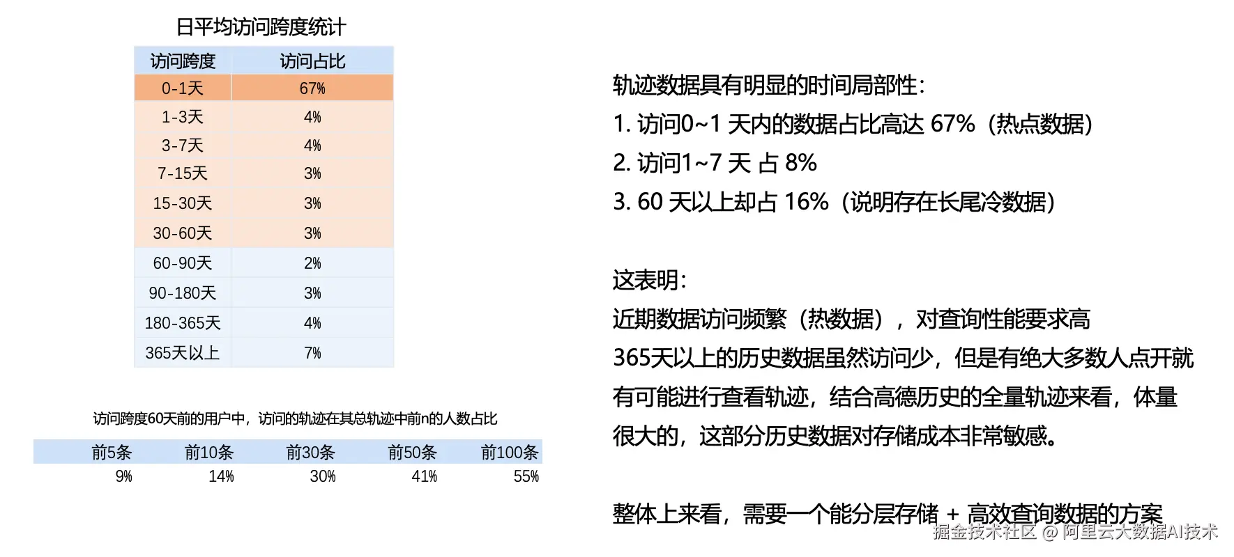 0--1 天(当天与昨天)的访问占比约为 67%。这部分数据访问最为集中,可定义为热数据。
