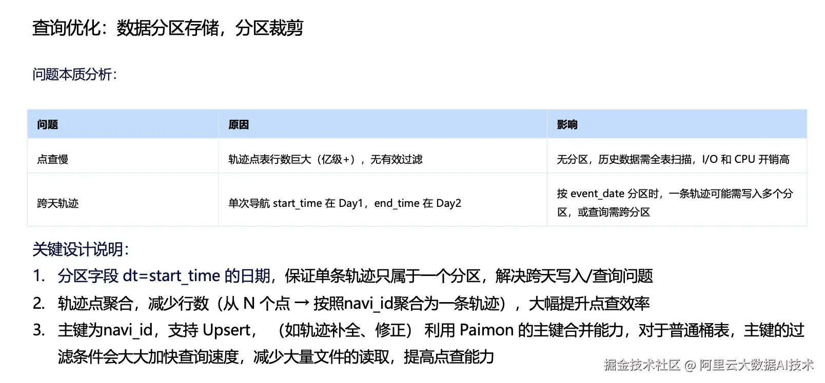 在读取性能方面,我们从业务访问特征出发对数据进行了分区存储。以千亿级轨迹点查询场景为例,若缺少合理分区,从海量历史数据中定位一条轨迹可能需要触发全表扫描,导致 I/O 与 CPU 开销显著上升。