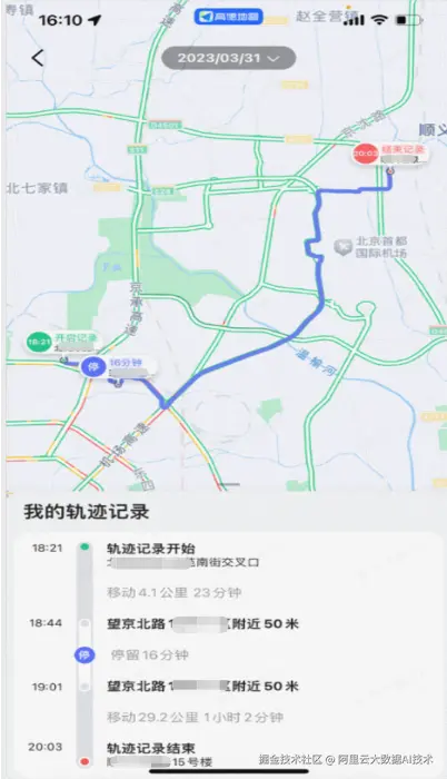 下图展示的是端侧"工作地图"的一个应用场景。通过该功能,用户可以查看一段轨迹在何时、何地开始 ,在哪些地点停留以及停留时长 ,并在结束后记录其最终结束位置 。