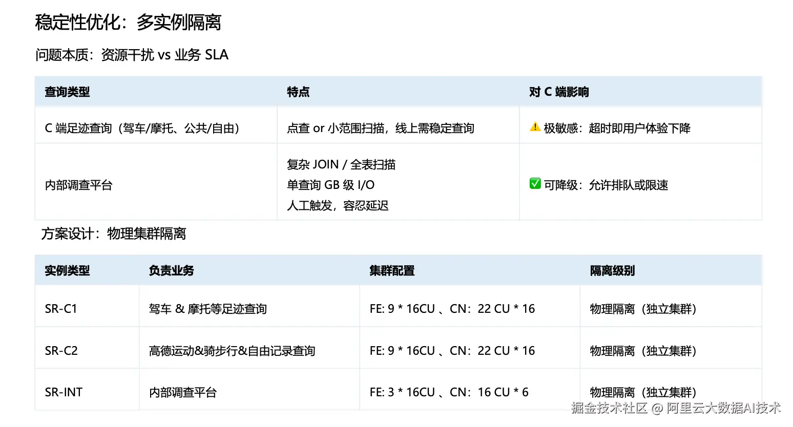 最后一类需要重点解决的是稳定性与资源隔离问题。前文提到,轨迹数据既服务于 C 端在线业务,也支撑内部调查平台等内部工具,两类业务在 SLA 与查询特征上存在明显差异,若缺乏隔离机制,容易产生资源干扰。