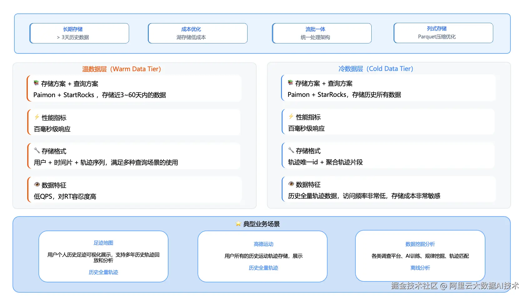 面对轨迹数据"高实时、高并发、长周期存储"的典型特征,高德团队以访问跨度为依据完成热/温/冷分层,并以 Apache Paimon + StarRocks 构建统一的数据底座,支撑轨迹数据的近实时写入与高性能查询。