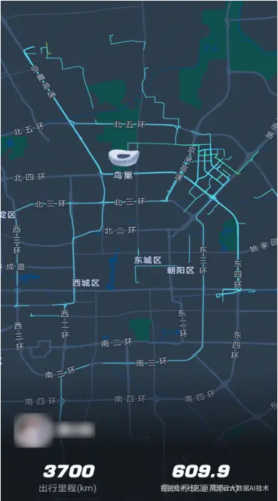 同时,高德地图会将用户的轨迹点与道路进行实时轨迹匹配,从而渲染出"足迹地图"的背景图。以下图为例,该图展示了一位用户在北京范围内行走过道路的渲染效果。