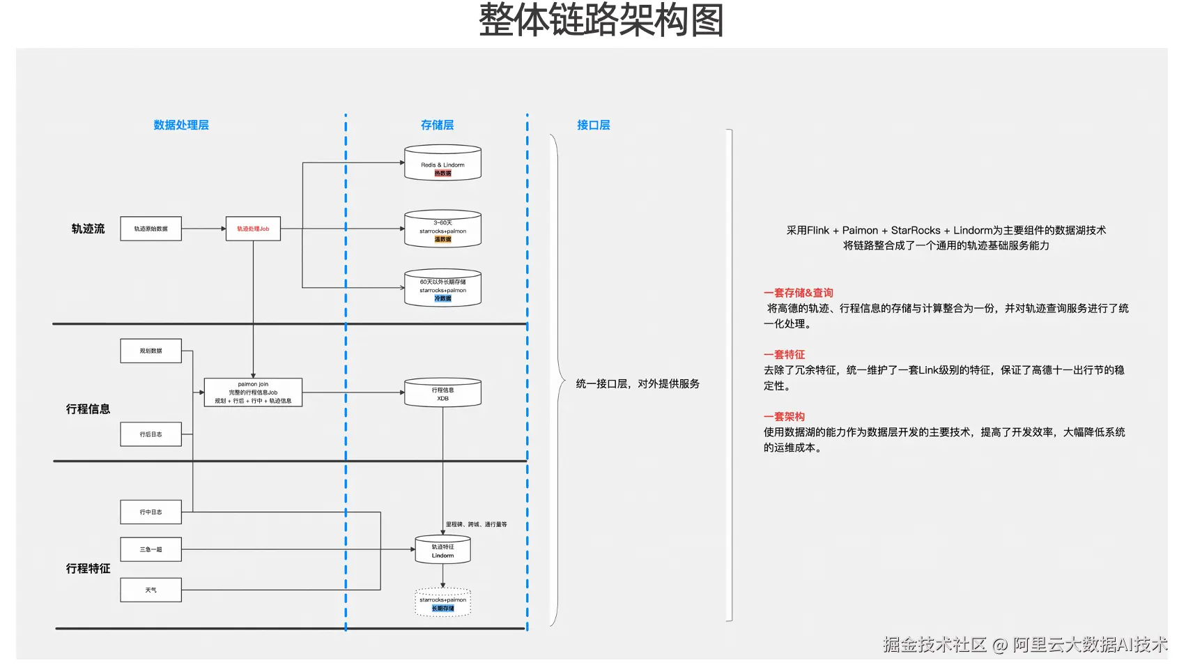 整体链路的架构示意图可按三层理解:数据处理层、存储层与接口层。