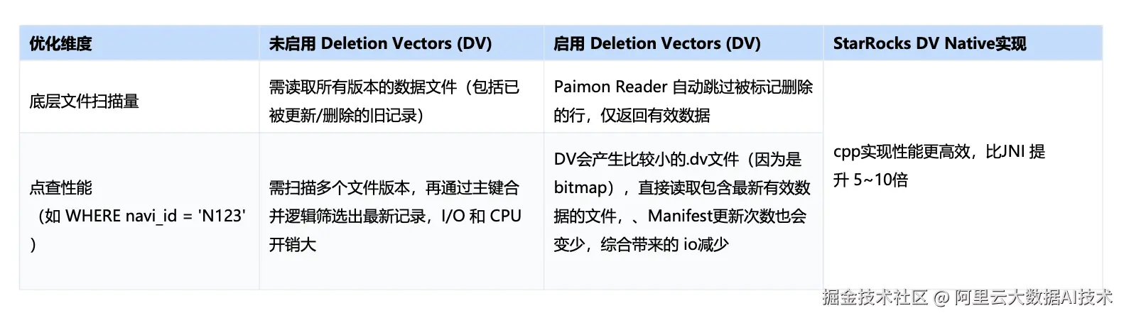 此外,该表开启了 DV(Deletion Vector)相关能力:当 Reader 读取开启 DV 的表时,可自动跳过已标记删除的行,仅返回最新有效数据;同时,Manifest 的更新频次也会降低,综合带来 I/O 的进一步减少。配合 StarRocks 的 DV Native 实现(C++),整体执行效率相较 JNI 路径可获得显著提升(可达到 5 倍以上)。