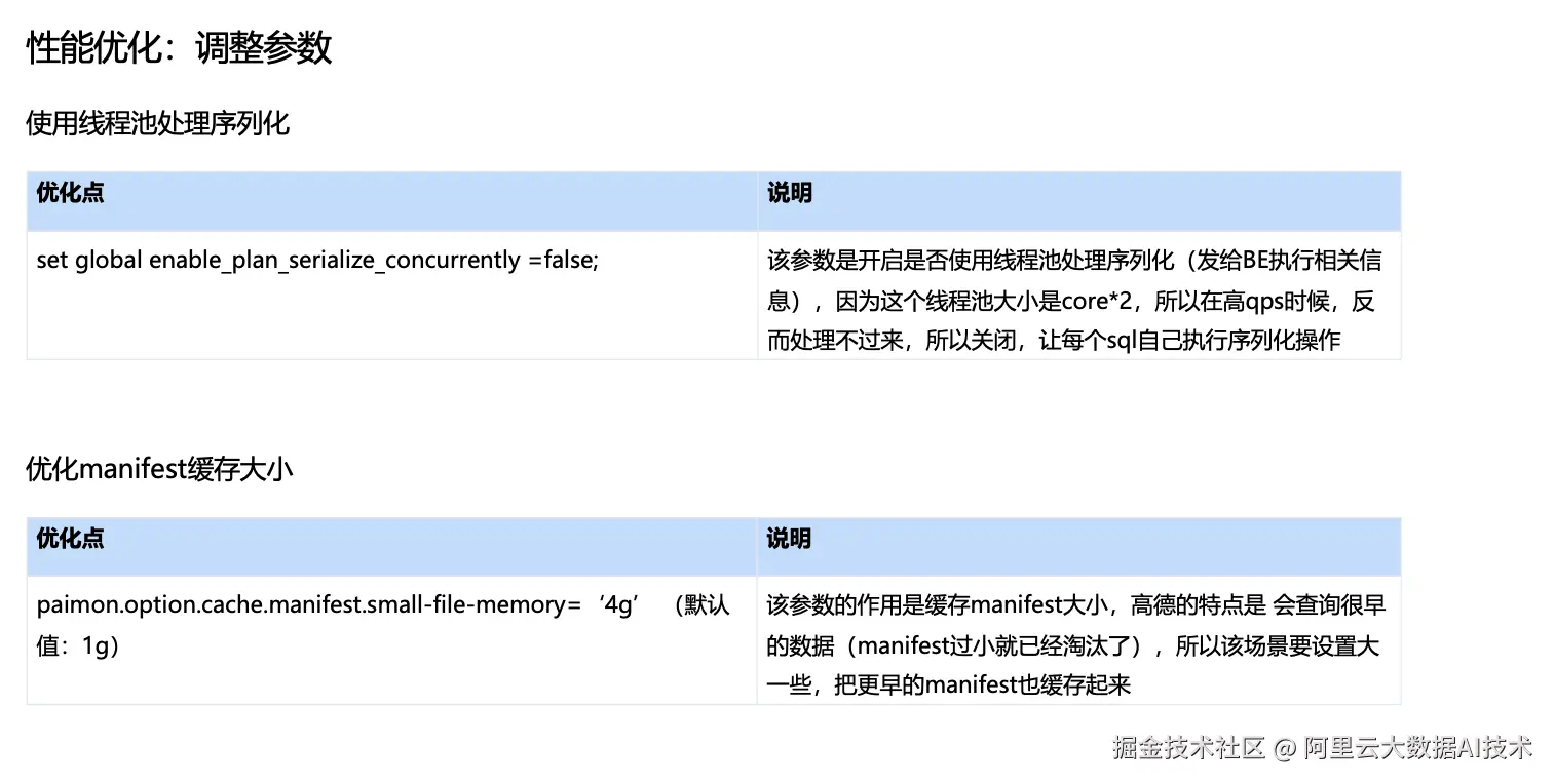 我们也尝试过开启"使用线程池处理序列化"的相关参数。但由于该线程池默认大小通常为 CPU 核心数的 2 倍,在高 QPS 场景下反而容易形成排队与瓶颈。为此,我们将该参数设置为 false ,使序列化由每条 SQL 在执行过程中自行完成。 此外,我们将 manifest 缓存大小从默认的 1GB 调整至 4GB,用于提升 manifest 命中率。高德轨迹查询存在一定比例的"访问更早历史数据"的特征,若 manifest 频繁过期并被淘汰。扩大缓存后,可覆盖更长时间范围的 manifest 元数据。