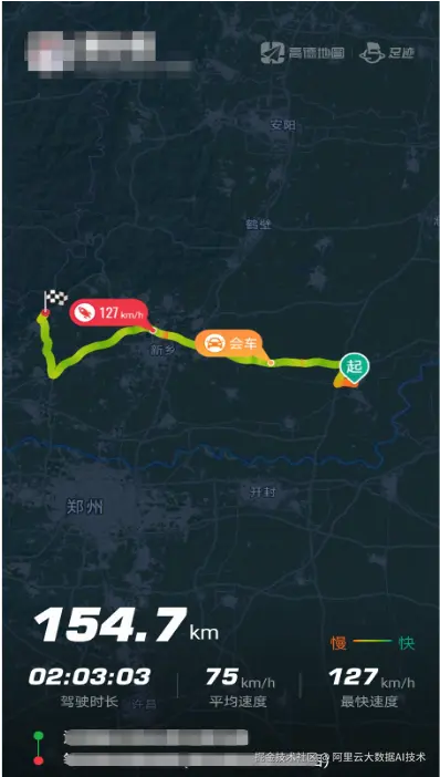 以"足迹地图"功能为例:用户完成授权后,每一次导航结束,其行程轨迹会被记录并展示在轨迹列表中。用户打开某一段轨迹后,页面会展示该次行程的基础信息,例如驾驶时长、驾驶里程、平均速度等;同时还会在端上渲染出轨迹形状及关键点特征信息,例如会车位置、最大速度点等。