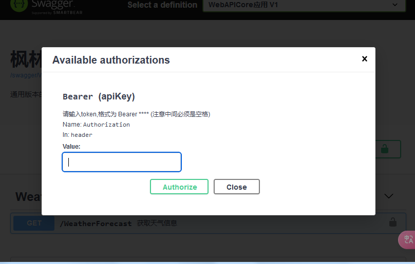 Description = "请输入token,格式为 Bearer **** (注意中间必须是空格)",