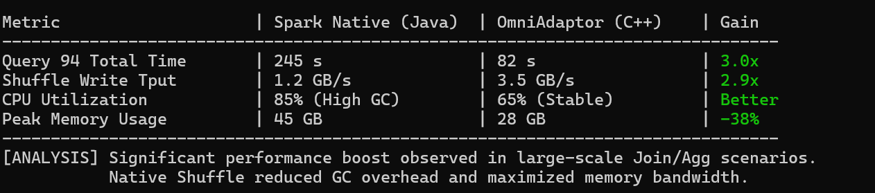 | 指标 | Spark Native (Java) | OmniAdaptor (C++) | 提升幅度 | 原因分析 |