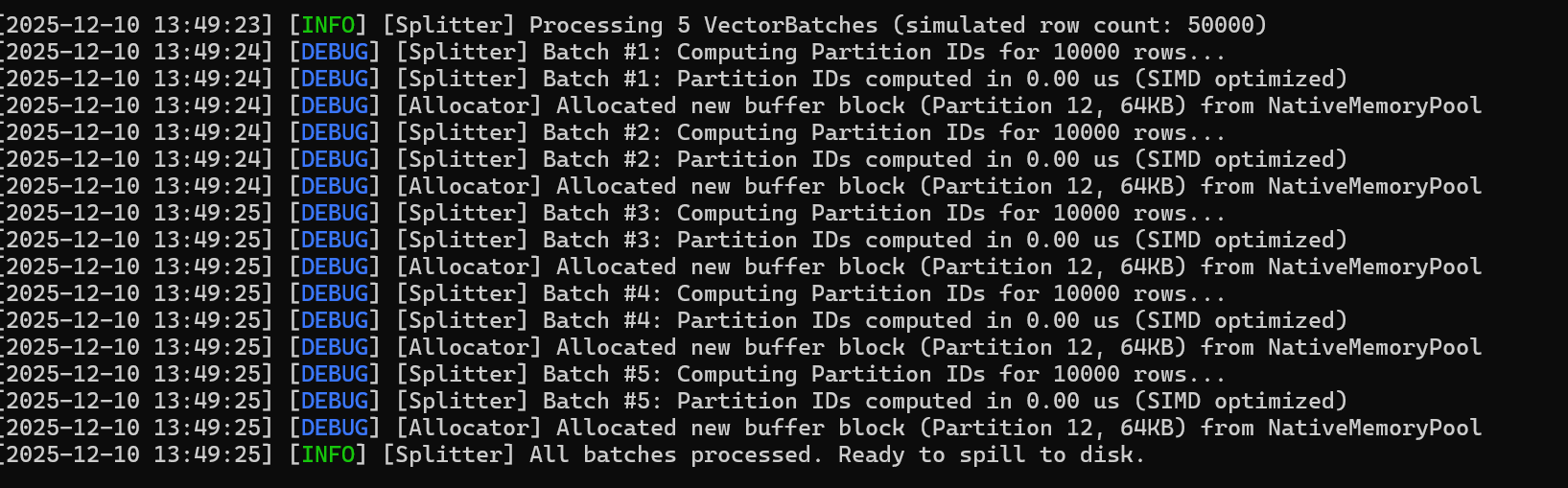 Native Shuffle Splitter 在处理一个 VectorBatch 时的整体数据流。可以看到分区计算、批次拆分和 SIMD 加速的整体过程,其耗时通常在 微秒级