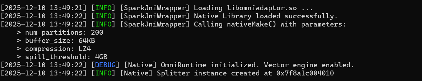 这个过程需要 JVM 与 Native 之间建立稳定的交互环境,因此 OmniAdaptor 在启动时会通过 JNI 完成一系列初始化:创建 Native 上下文、加载 C++ 计算库、建立算子执行环境等。