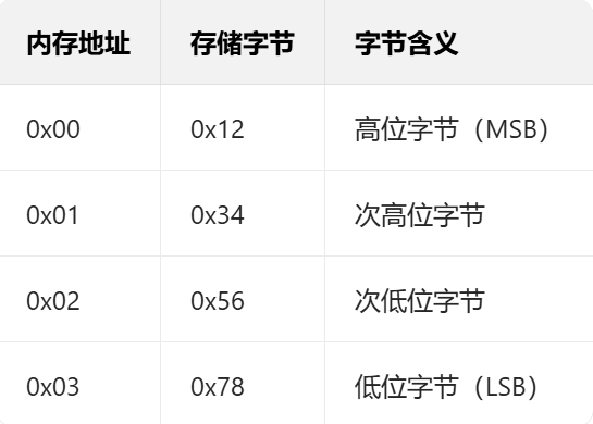 计算机最小存储单位是 "字节(Byte,8 位)",但实际应用中需处理多字节数据(如 16 位端口号、32 位 IP 地址、32 位浮点数、64 位整数)。例如,数值0x12345678(32 位十六进制,对应十进制 305419896)由 4 个字节组成:0x12(高位字节)、0x34、0x56、0x78(低位字节)。字节序定义了这 4 个字节在内存中的排列顺序。