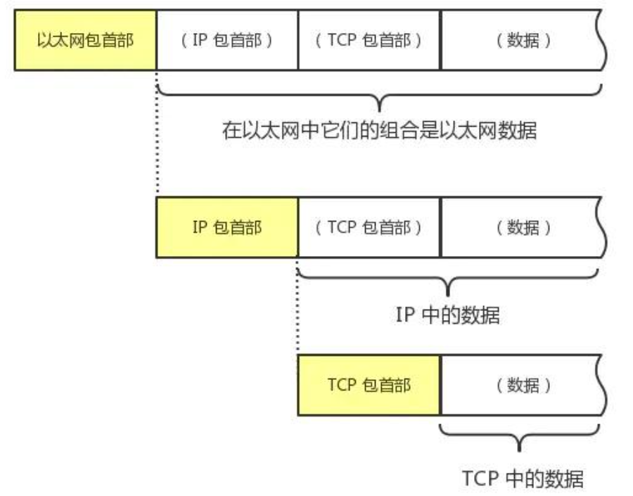 通过四层模型可以将应用层的具体数据传输给对应设备,比如,我们需要发送一个index.html 。两台电脑在应用层都使用HTTP协议(即都使用浏览器)。在传输层,TCP协议会将HTTP协议发送的数据看作一个数据包,并在这个数据包前面加上TCP包的一部分信息(部首)在网络层,IP协议会将TCP协议要发送的数据看作一个数据包,同样的在这个数据包前端加上IP协议的部首在数据链路层,对应的协议也会在IP数据包前端加上以太网的部首。