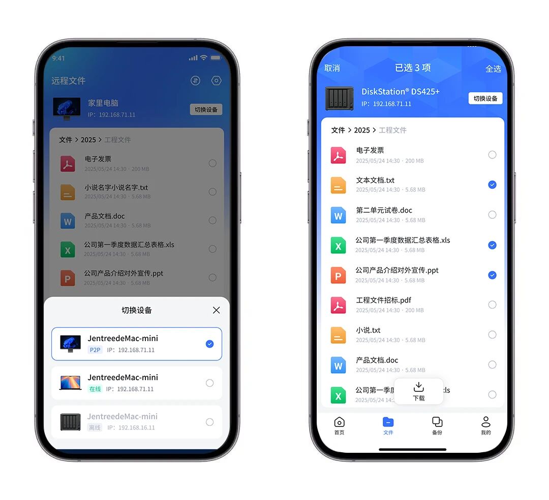只需扫码或手机号登录,客户端就会自动扫描局域网,通过设备指纹库(如群晖DSM、威联通QTS的默认端口)精准识别设备类型,并自动生成服务卡片。