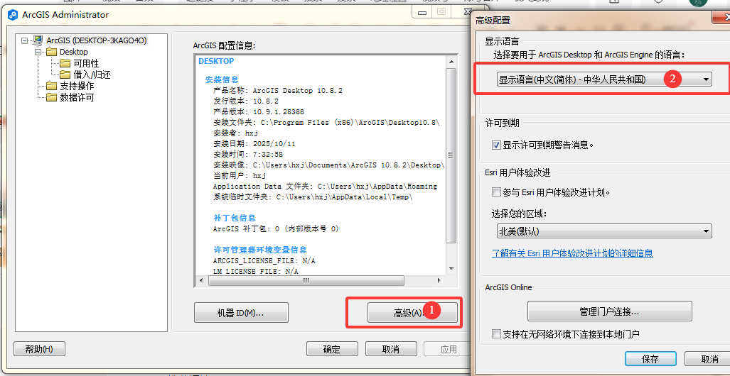 2、安装汉化包之后,到开始程序里面启动,ArcGIS Administrator,选择高级,切换一下语言!