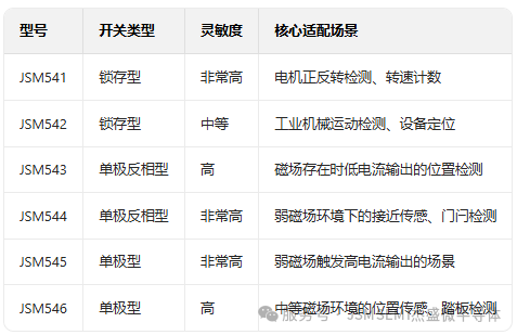 A1204 的型号选择较为单一,难以适配不同磁场强度、输出逻辑的多元场景。而 JSM54X 系列提供 6 款细分型号,涵盖锁存型、单极型、单极反相型三种开关类型,灵敏度从高到极高不等,精准匹配各类应用需求: