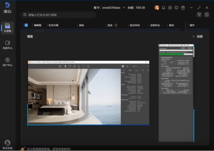 更值得一提的是,这个阶段建议充分利用本地设备的空闲资源。由于云端承担了所有计算压力,本地电脑会变得非常流畅,你可以同时进行新的模型搭建、方案修改、后期处理等工作,实现"渲染不等待,工作不耽误"的并行效率。如果想了解渲染进度,只需在方便时联网,例如渲云通过云渲染平台客户端,就能实时查看任务进度、渲染预览图等信息,部分平台还支持异常提醒功能,确保你能及时掌握任务状态。