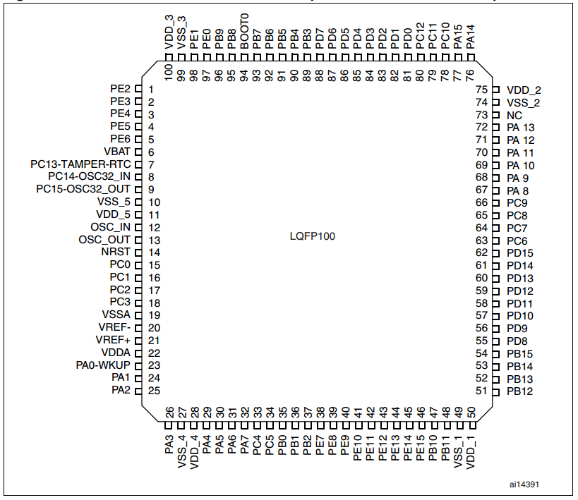 芯片四周是引脚,左下角的小圆点表示1脚,然后从1脚起按照逆时针的顺序排列(所有芯片的引脚顺序都是逆时针排列的)。 开发板中把芯片的引脚引出来,连接到其他各种芯片上(比如传感器), 然后在STM32上编程(实际就是通过程序控制这些引脚输出高电平或者低电平)来控制其他芯片工作,通过做实验的方式来学习STM32芯片的各个资源。
