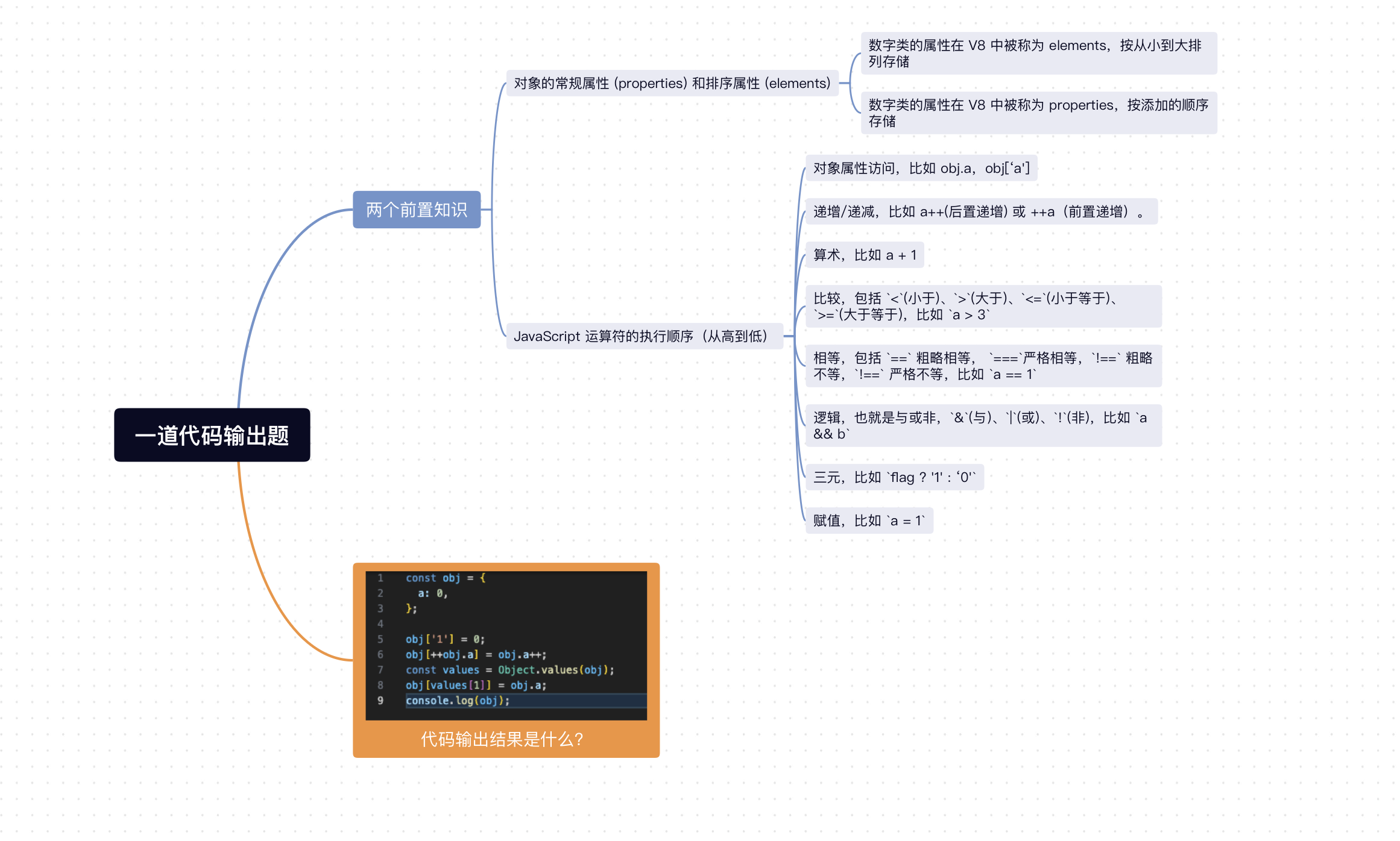 JavaScript对象中,属性的设置顺序并不一定是循环打印顺序,在V8中,数字类的属性在被称为elements(按从小到大排列存储),字符类属性被称为properties(按添加顺序存储)。 JavaScript运算符的运算顺序是对象属性访问 > 递增/递减 > 赋值 ,对于赋值运算符LHS = RHS,会先求出左侧LHS的引用(Reference),再计算右侧RHS的值,最后将右侧的值赋值给左侧的引用。