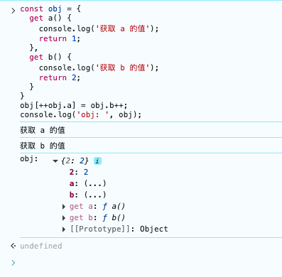 obj.a的值, 取到的值为1, 然后执行前置递增++obj.a,结果为2,然后程序就知道要往obj的2属性上赋值了。 - 第二步,然后再取