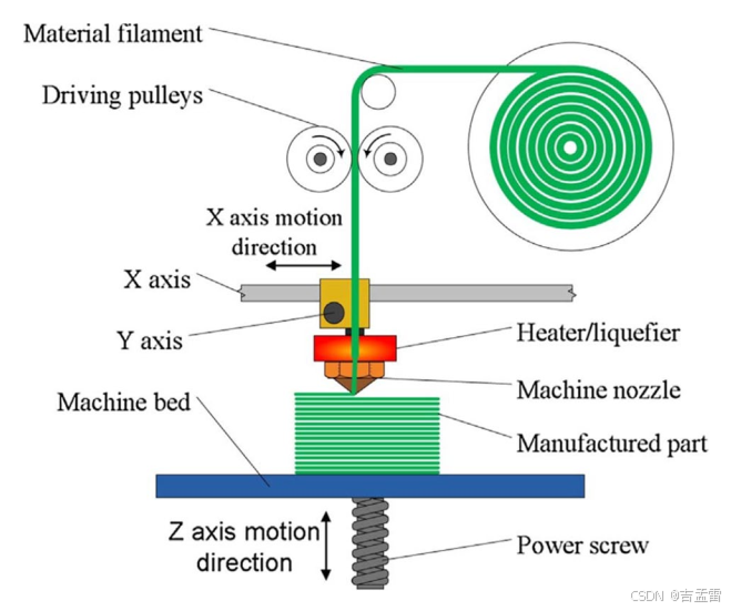 熔融沉积型Fused deposition modeling (FDM) 是目前应用最广泛增材制造的3D打印技术,FDM工艺的原理如下图所示,丝材通过机器的挤出机和喷嘴连续进给,通过两个相对旋转的滚轮。材料逐层沉积在构建平台上,直到达到所需的产品形状和尺寸。在分层过程中,打印喷嘴根据G代码文件中原始CAD模型的空间坐标来回移动,直到生产出所需大小和形状的组件。