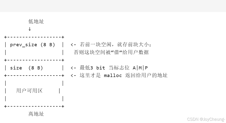 malloc 返回给用户的地址 并不是 真正从系统要到的起始地址,而是 紧接在头部后面的用户区。头部里保存了本次分配的大小(以及标志位、魔数等)。