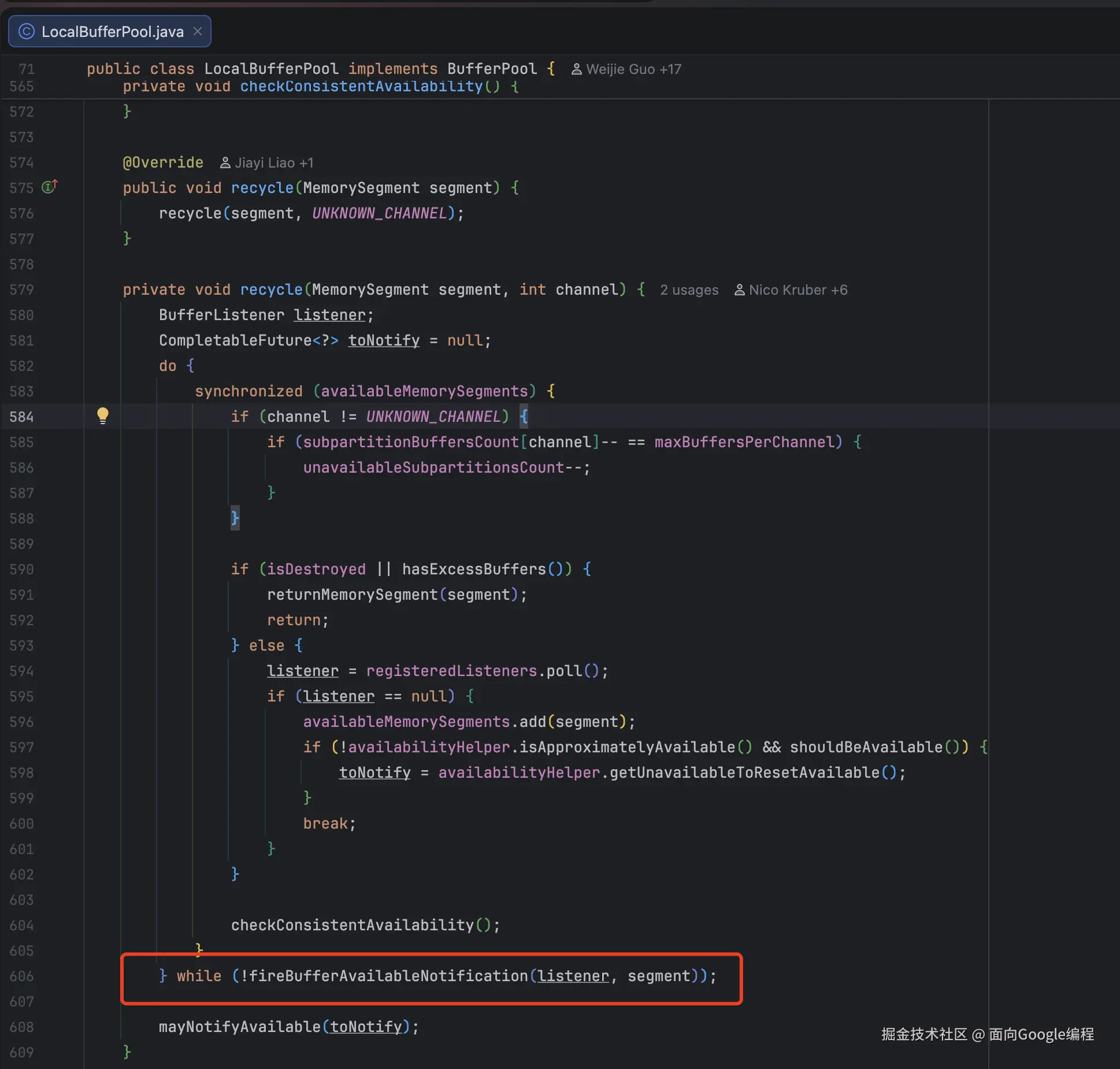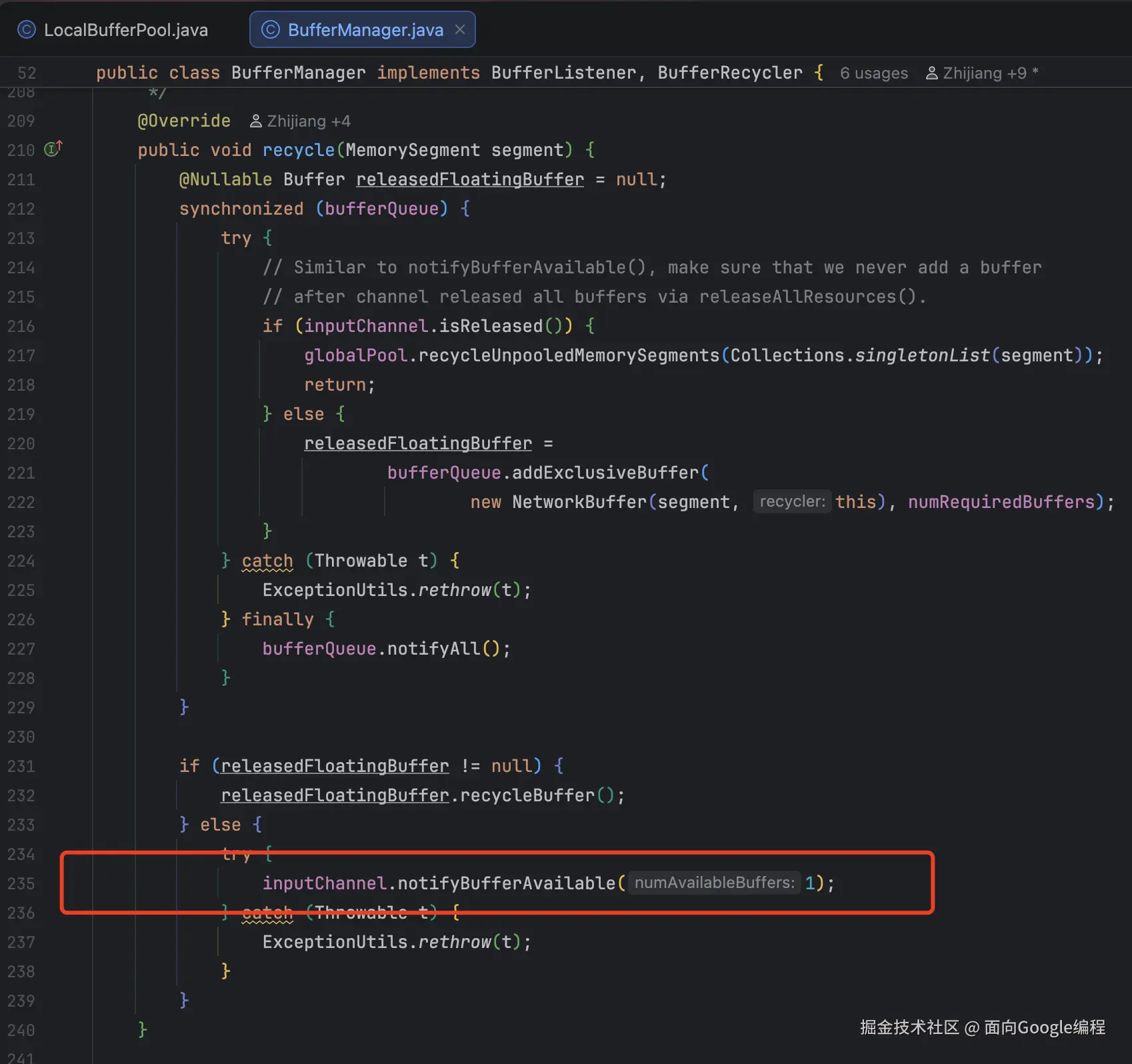 一种是 LocalBufferPool 回收空闲 buffer 时,会将 buffer 分配给申请者,分配之后会调用对应 InputChannel 的 notifyBufferAvailable 方法通知更新 Credit。