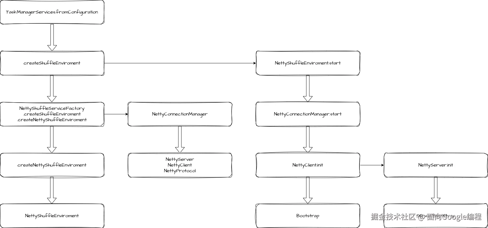 Netty 的初始化阶段是在 TaskManager 启动的过程中执行的。在 TaskManagerServices.fromConfiguration 方法中,会创建并启动 ShuffleEnvironment。