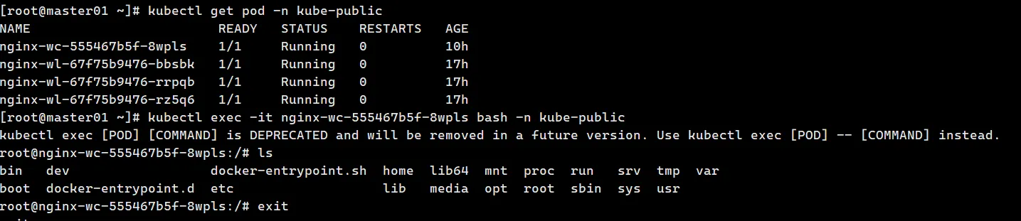 kubectl exec -it nginx-wc-555467b5f-8wpls bash -n kube-public