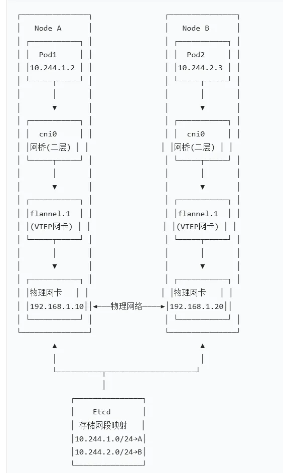 - Etcd 存储:Pod 网段 → 节点物理 IP(如 Node A: 10.244.1.0/24 → 192.168.1.10;Node B: 10.244.2.0/24 → 192.168.1.20)。