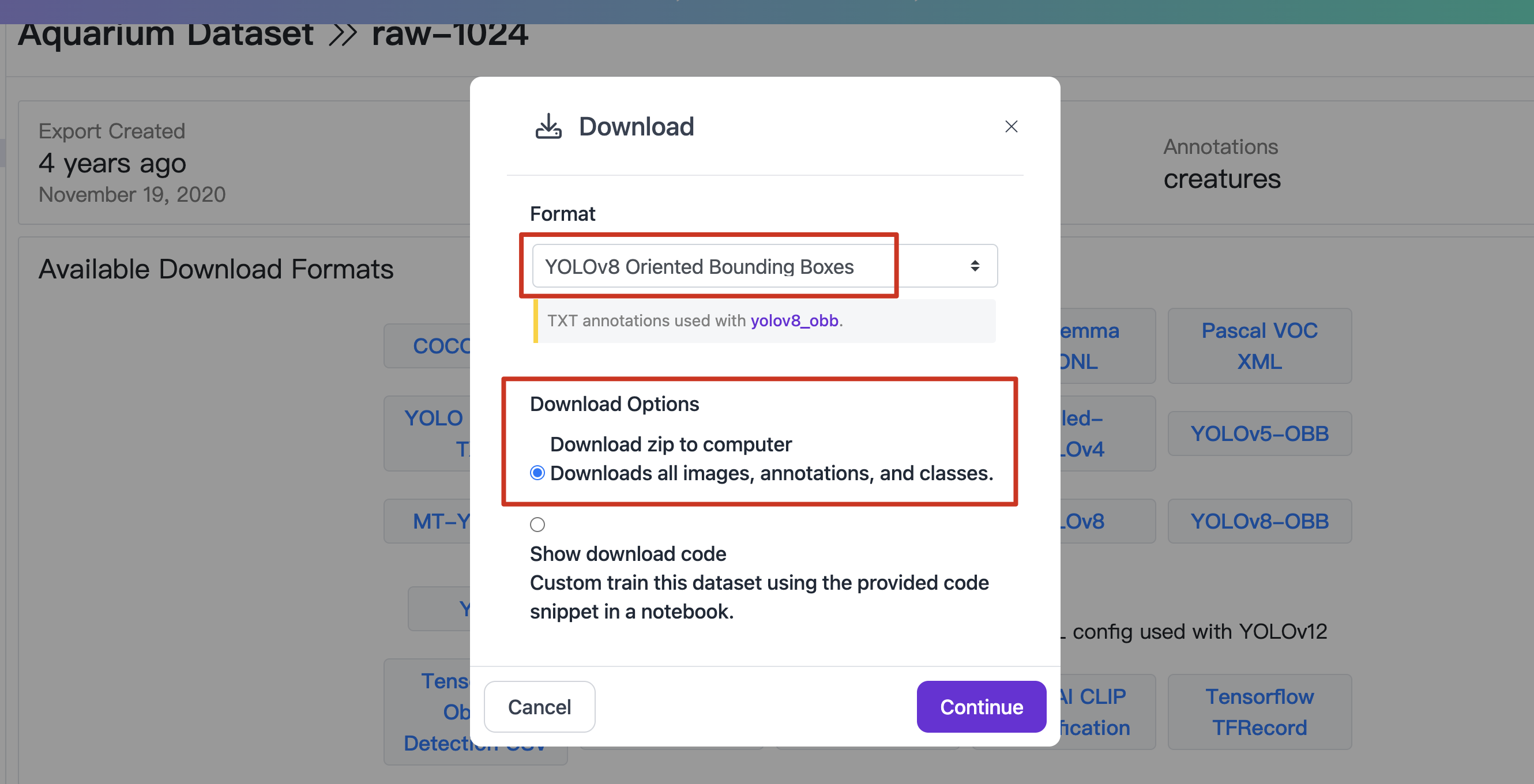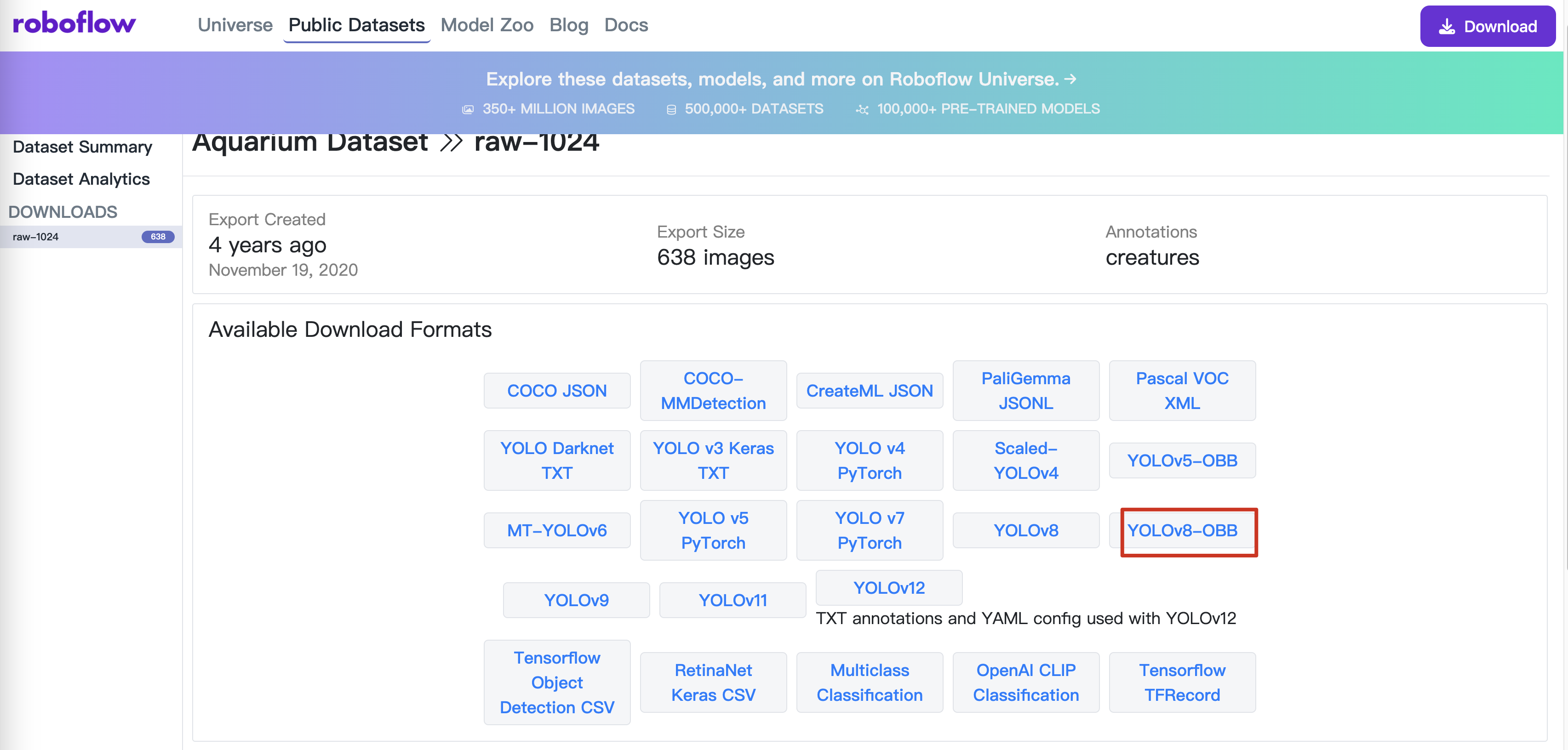 选择 YOLOv8-OBB 格式,下载水族馆数据集(Aquarium Dataset)。