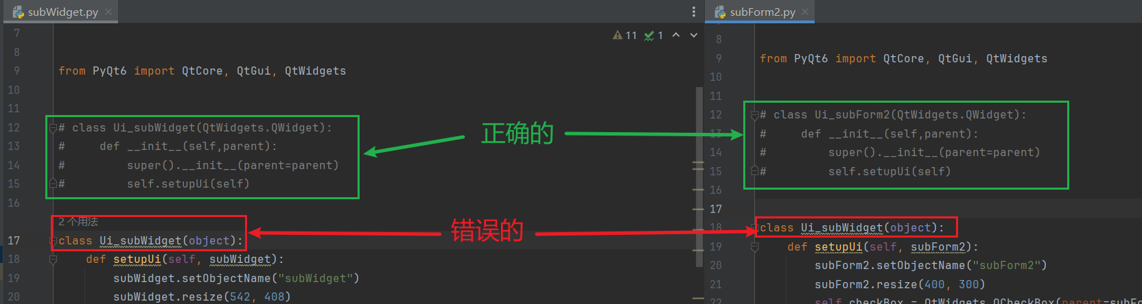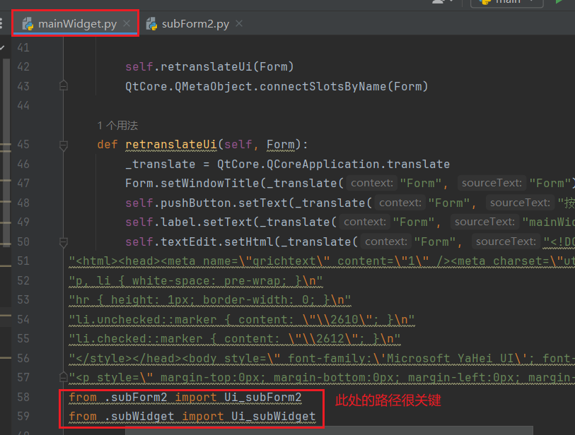 在mainWidget提升了窗体之后呢,使用pyuic生成mainWidget.py文件。打开mainWiget会生成如下图的内容,如果运行不了,检查一下路径subForm2的路径,我是将mainWidget、subWidget和subForm2放在同一个目录下的。下图标注的路径和类名很关键,可能就是类名和路径导致运行不起来。