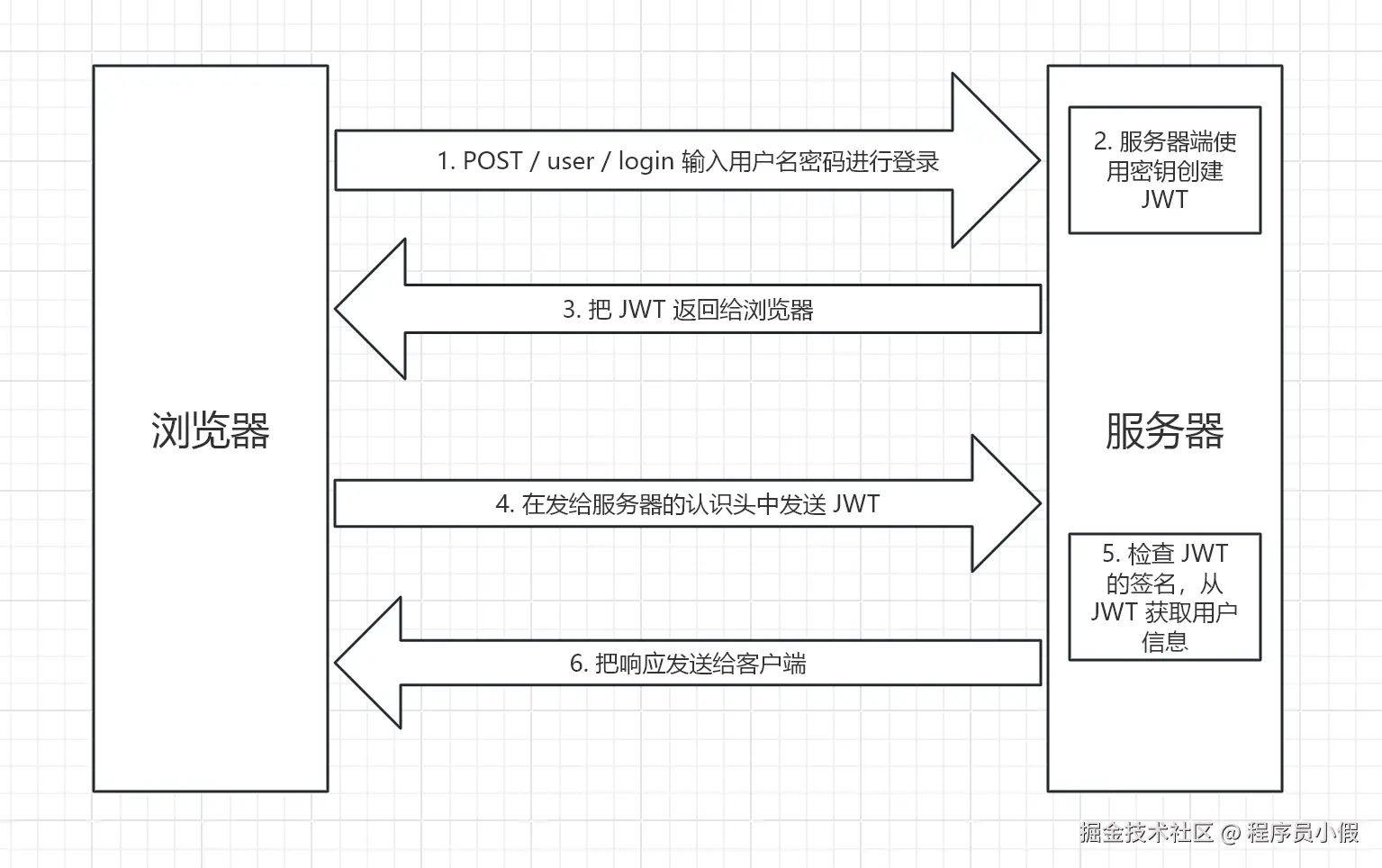 - 服务端的保护路由将会检查请求头 Authorization 中的 JWT 信息,如果合法,则允许用户的行为