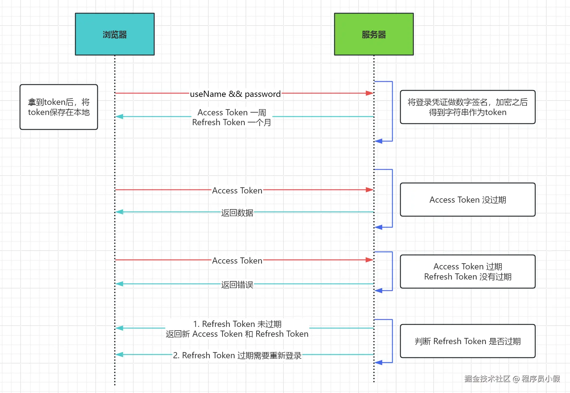 - Refresh Token 及过期时间是存储在服务器的数据库中,只有在申请新的 Acesss Token 时才会验证,不会对业务接口响应时间造成影响,也不需要向 Session 一样一直保持在内存中以应对大量的请求。