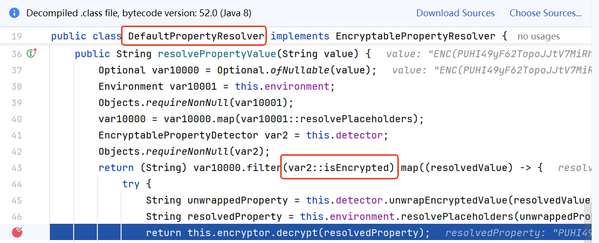 SpringBoot在项目启动的时候,会调用EncryptablePropertyResolver去判断,是否包含ENC,如果包含 "ENC(密文) ",就会自动进行解密