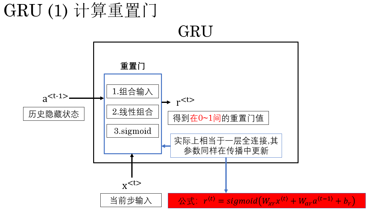 在 GRU 的实现逻辑中,对于当前步新隐藏状态的计算,第一步是计算重置门 。