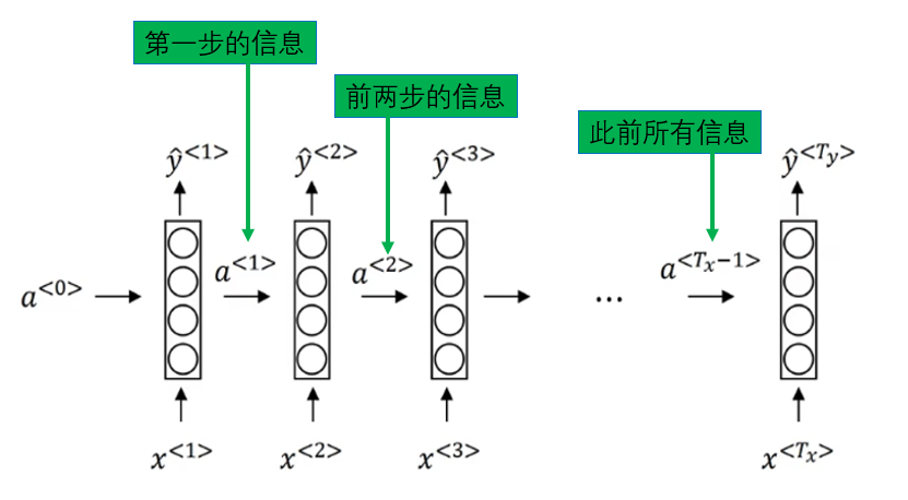 - 仍然有隐藏状态 \(a^{<t>}\)