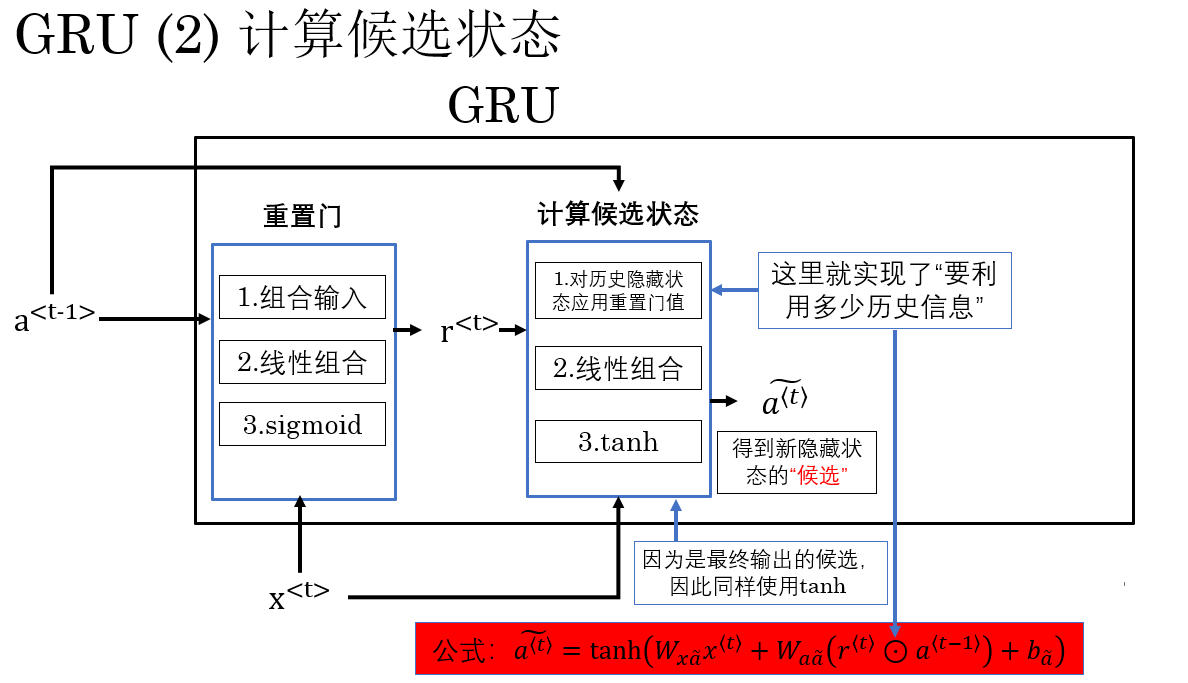 你会发现,这时我们得到的候选隐藏状态 \(\tilde{a}^{\langle t \rangle}\) 就是是当前步的"新记忆" ,它既包含当前输入信息 \(x^{\langle t \rangle}\),也包含经过选择性过滤的历史信息 \(r^{\langle t \rangle} \odot a^{\langle t-1 \rangle}\)。