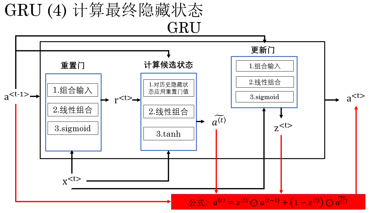 - 计算最终隐藏状态 \(a^{\langle t \rangle}\) → 使用更新门进行加权融合: