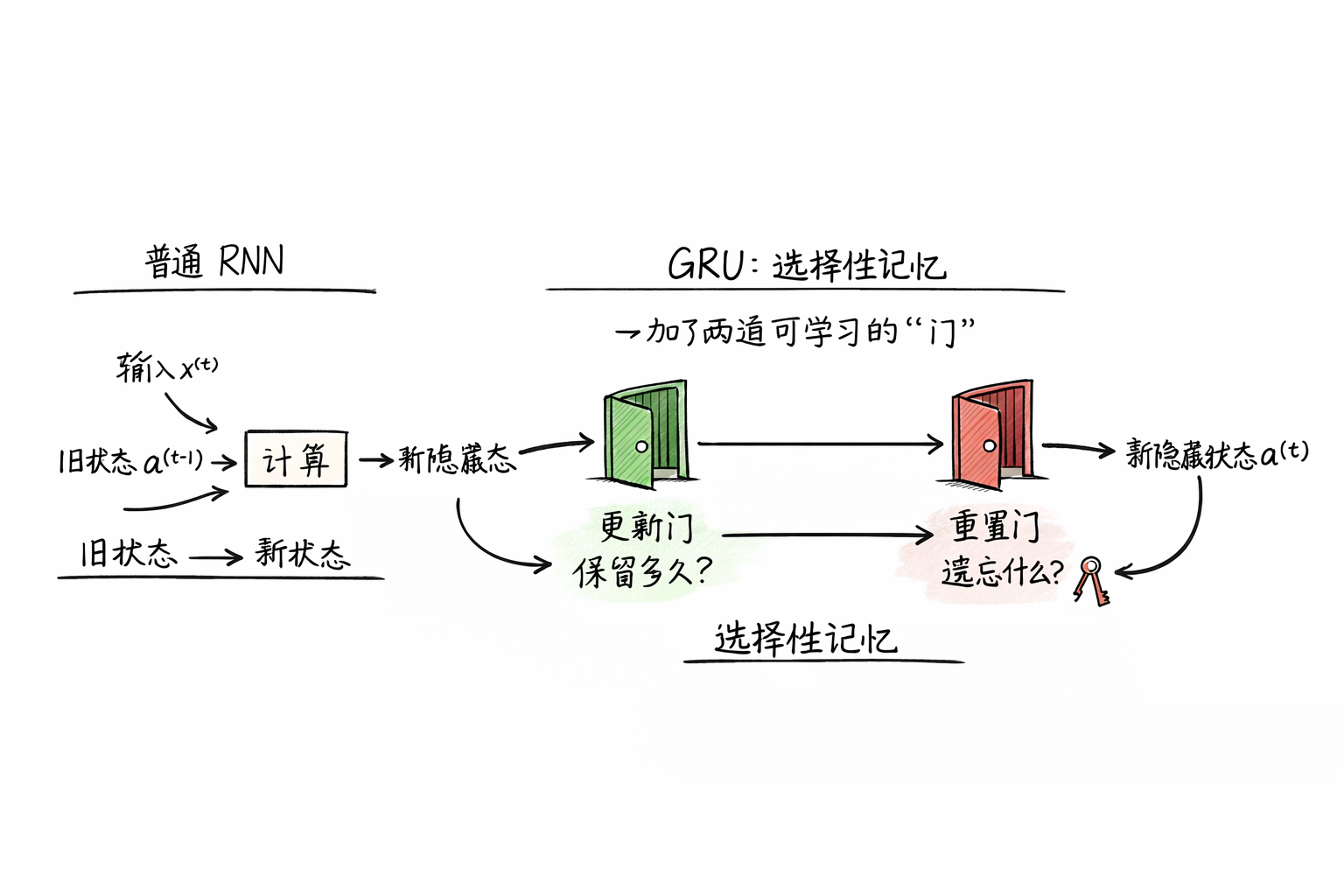 两道门结合,使 GRU 能够在长序列中保留重要历史信息,同时在必要时灵活忘掉无关历史,实现"更好、更有用的记忆"。