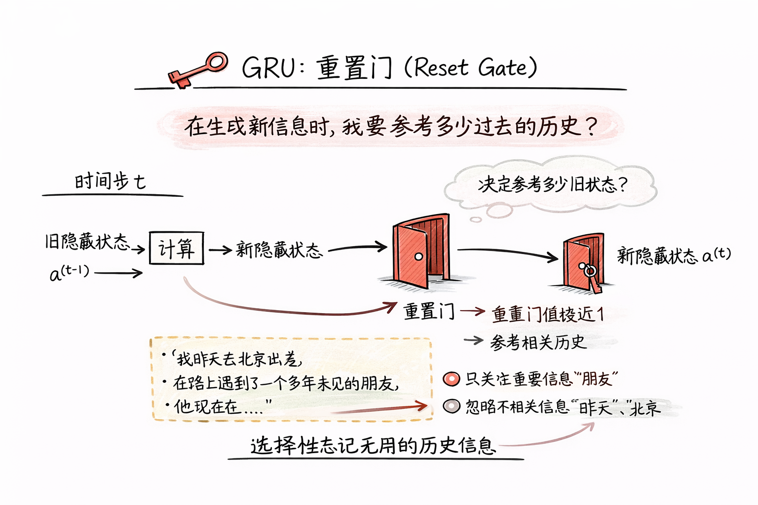 - 当历史信息不相关 → 重置门值接近 0 → 模型"暂时忘掉过去"