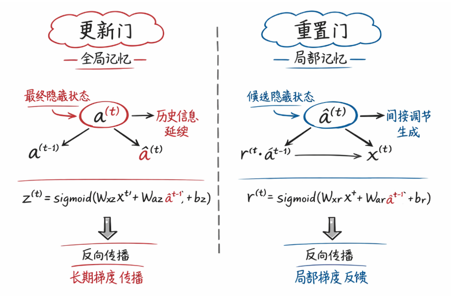 | 梯度传播机制 | 更新门接近 1 时,隐藏状态近似复制,梯度可跨时间步稳定传播 | 给梯度修了一条高速公路 |