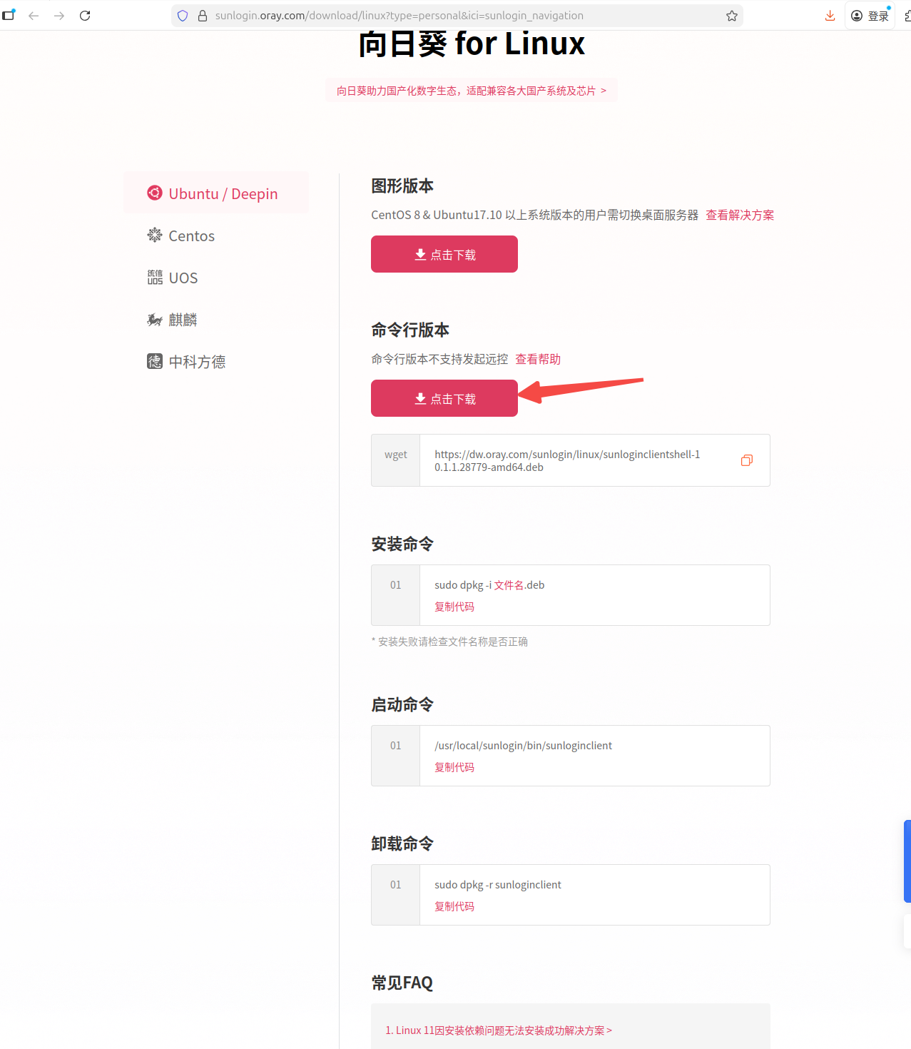 访问向日葵官网下载页,选择Linux个人版(如sunloginclientshell-10.1.1.28779-amd64.deb)