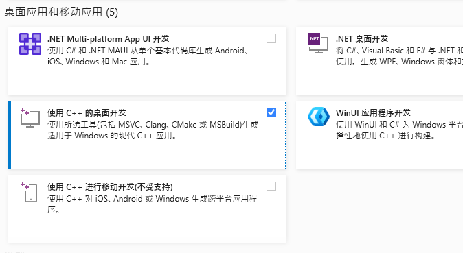 选择C++桌面开发,(主要是要用他的一个工具x64 Native Tools Command Prompt for VS)